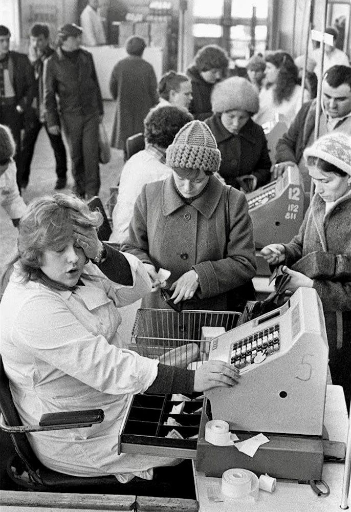 Магазин самообслуживания, возможно, универсам. Хотя и не очень типовой — вход там же, где и выход. Не очень понятно, что за прилавок возле дверей. Слева, за спиной кассира, контролёр, следит, чтобы чего не украли. Но больше всего мне реакция кассира понравилась: судя по всему, народ идёт с рублями, мелочи на сдачу в кассе нет. Тоже вполне типовая советская ситуация, особенно в день зарплаты…