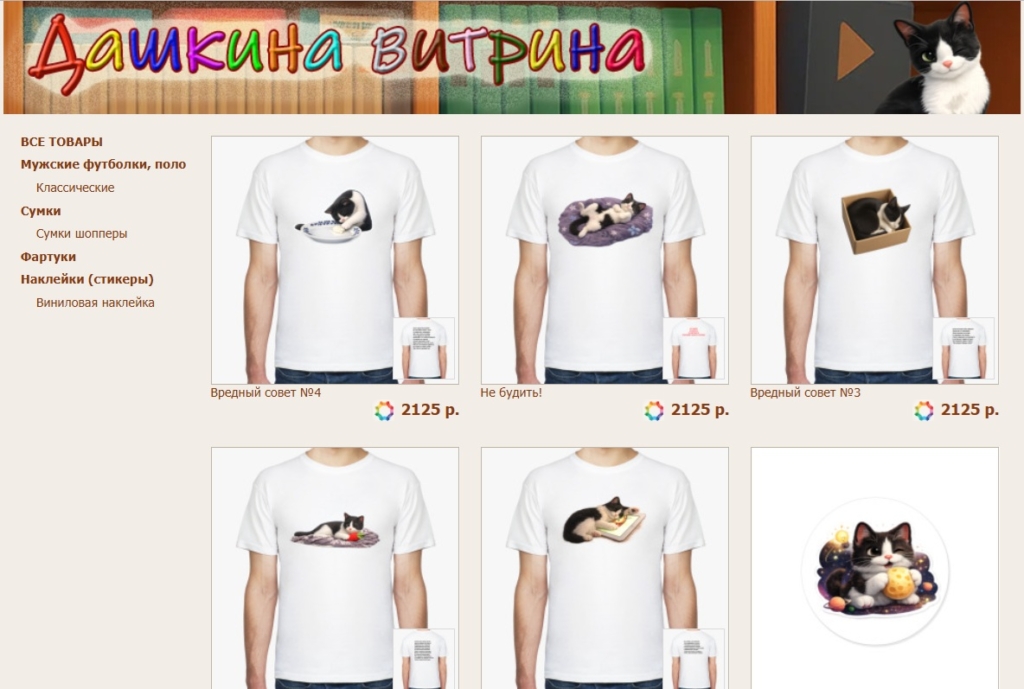 Мы с Дашкой на две головы подумали и решили попробовать ещё раз на Printdirect зайти, но уже с принципиально другими дизайнами. Все старые картинки убрал, загрузил новые макеты и на пробу создал несколько шопперов, футболок и фартуков. И наклеек добавил, всё с Дашкиной мордашкой. Саму витрину тоже обновил, теперь это выглядит вот так: