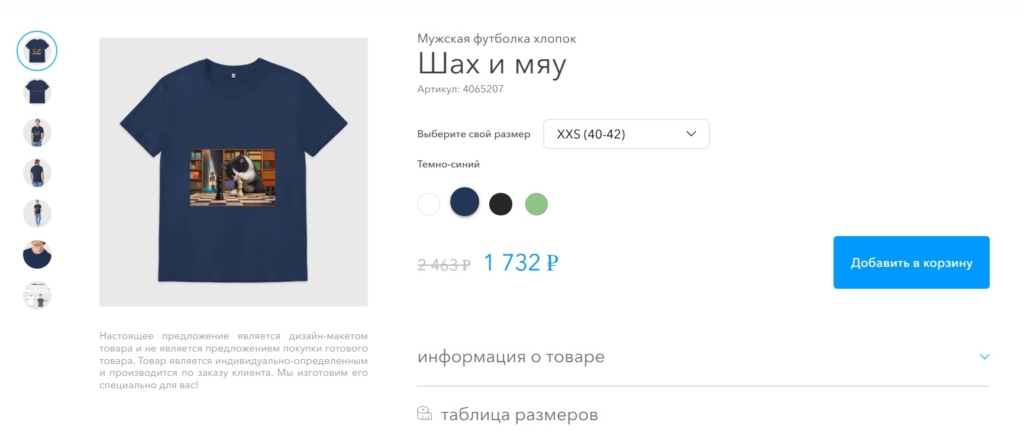 В отличие от Принтдирект, здесь не нужно заваливать витрину вариантами одного и того же принта. Ниже на странице можно выбрать мужскую, женскую или детскую одежду, выбрать другую модель и цвет. Ну и размер, конечно.