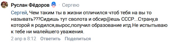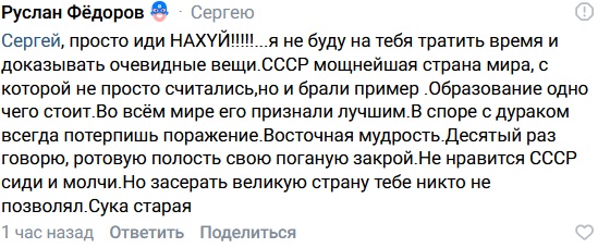 Я: Руслан, сильно сомневаюсь, что ты родился в СССР. Про образование лучше вообще не вспоминай, сперва учебник русского языка очень внимательно перечитай. Особенно раздел «Пунктуация». Для начала усвой простую истину: обращение на «вы» — это форма вежливости, а не уважения. Вот когда ты в личной переписке обращаешься на «Вы» с большой буквы — это уже выражение уважения. Впрочем, к тебе это не относится, ты очередное необразованное хамло.