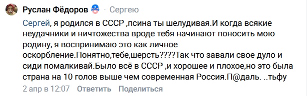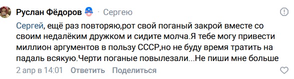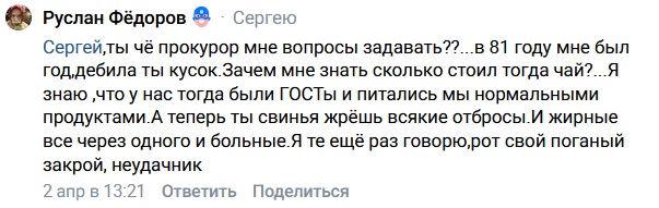 Я: Руслан, ты ничего доказать не можешь, от того и бесишься, истерики тут закатываешь. Ты просто очередной дурачок, который наслушался сказочек о светлом советском прошлом. По поводу спора: внимательно перечитай свои комментарии и убедись, что ты не привёл ни одного довода, ни одного факта в подтверждение своих слов. Только оскорбления, теперь ещё и мат. Это не спор, это полное признание тобой собственной беспомощности, полная и безоговорочная капитуляция. И ты сейчас даже не сам обосрался — ты всех своих единомышленников, всех, кто тебе эти сказки рассказывал, дерьмом измазал. Молодец. Продолжай в том же духе. Чем больше ты так будешь защищать коммунистические идеалы, тем меньше у вас сторонников будет. А я твои комментарии заскриню себе на память и другим на потеху.