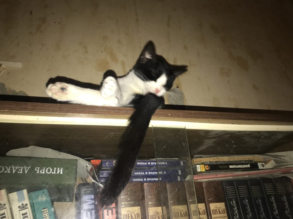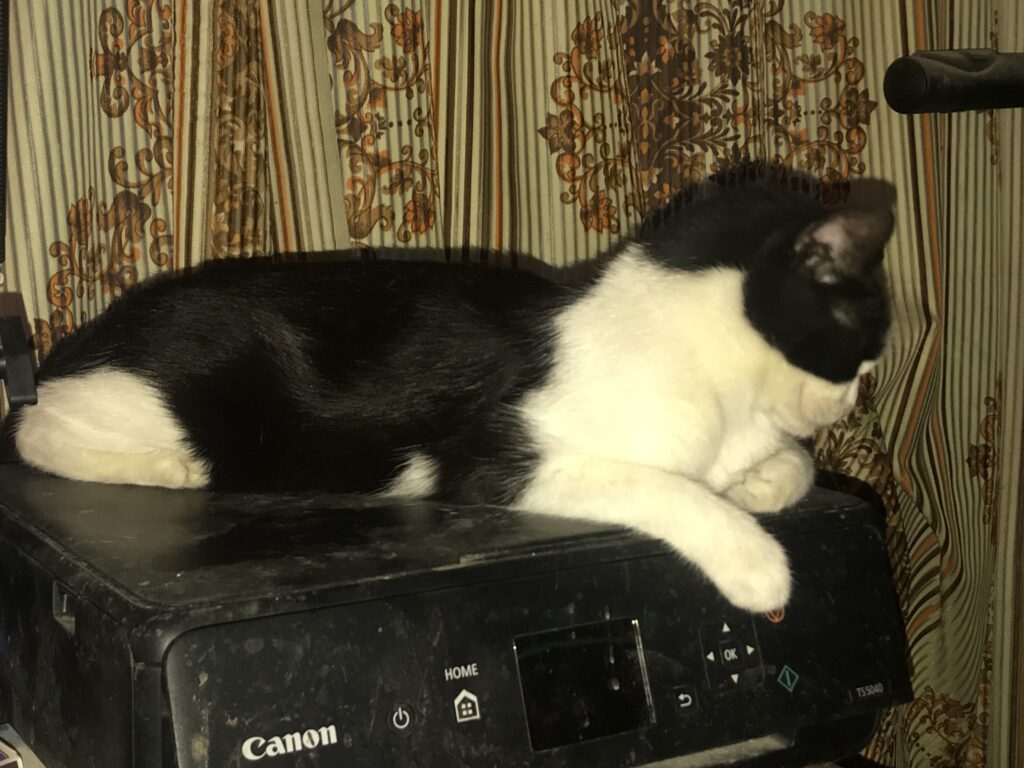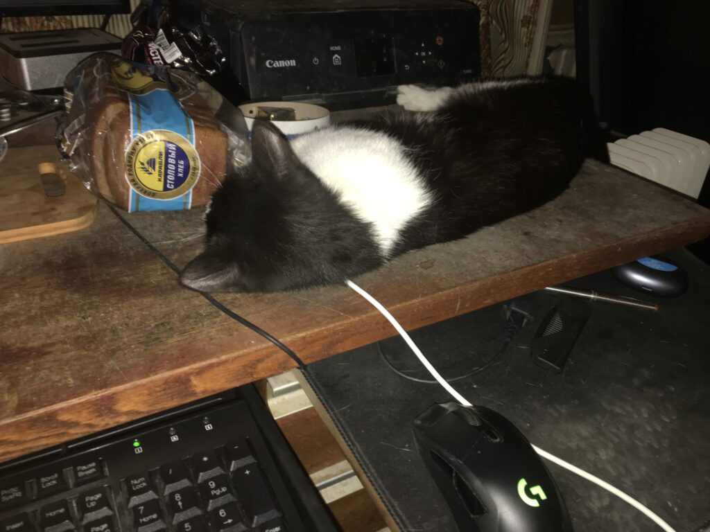 Ночью бродила в раздумьях, где бы поспать, вспомнила про местечко на системнике. Направилась под стол, а там полка. Спереди не запрыгнуть, только сбоку. Залезла, легла… Не то. Перед носом полка с клавиатурой. Вроде, места немного занимает — от столешницы сантиметров двадцать по высоте и чуть шире, чем сама клавиатура. То есть, места навалом. Но вот мешает.