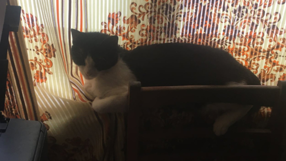 Охотница, затащила добычу.Уже на спинке кресла Дашка умудрилась разорвать оболочку, оторвала небольшой кусок с верёвочным хвостиком. И теперь эту...