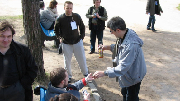 Очередная веха. Если кто не признал - я крайний слева с привычно идиотской физиономией. Снимок сделан в мае 2005-го года, куртке аккурат...